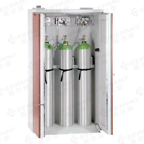 2.報警型氣瓶柜:專為存放可燃氣體而設計的。頂部增加了可燃氣體泄漏報警裝置。傳感器如檢測到可燃氣體泄漏,將會發(fā)出聲音和燈光報警,同時啟動頂風機排風。